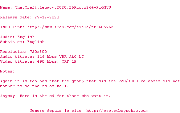 Voir le nfo de la release The.Craft.Legacy.2020.BDRip.x264-PiGNUS