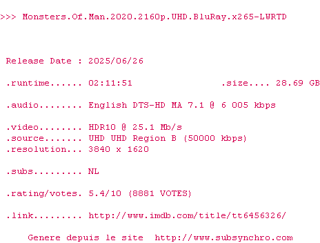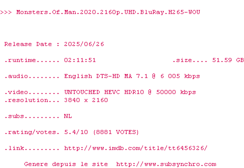 Voir le nfo de la release Monsters.Of.Man.2020.2160p.UHD.BluRay.H265-WOU