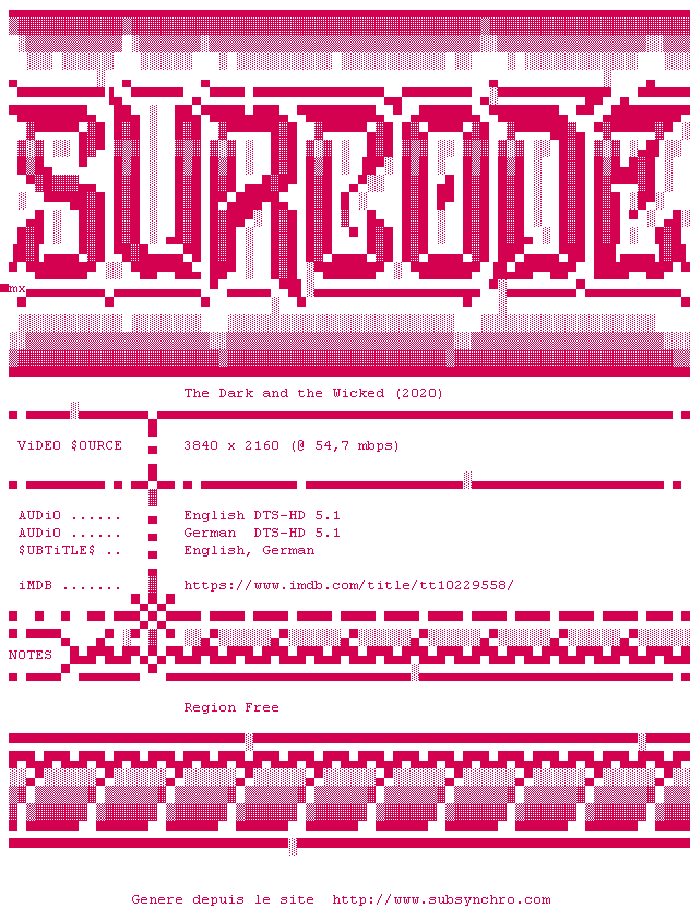 Voir le nfo de la release The.Dark.And.The.Wicked.2020.2160p.UHD.BluRay.x265-SURCODE