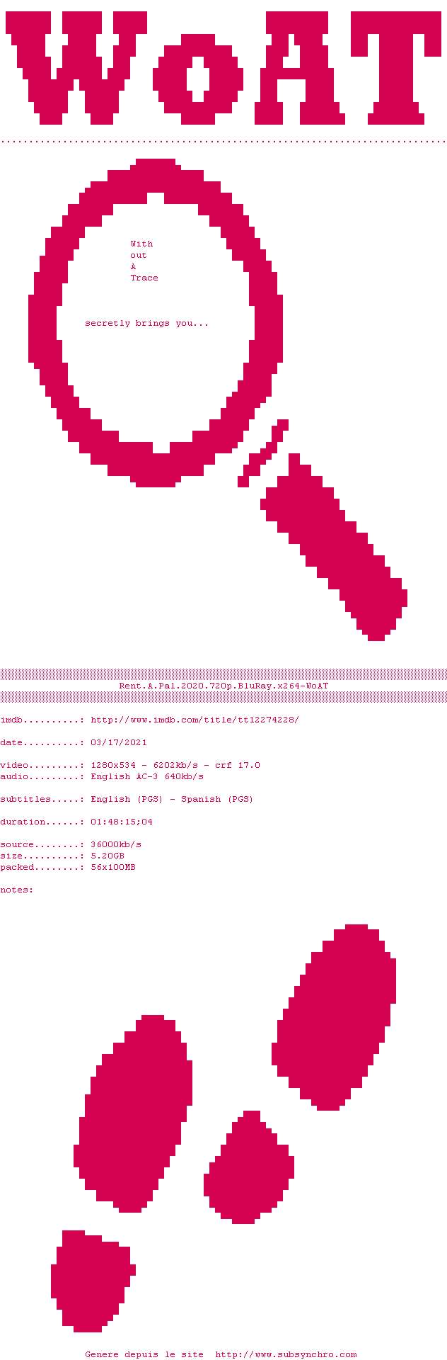 Voir le nfo de la release Rent.A.Pal.2020.720p.BluRay.x264-WoAT