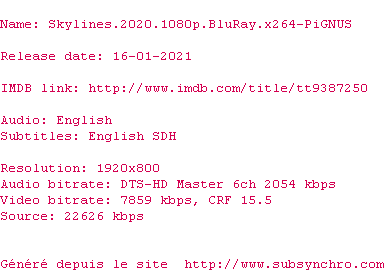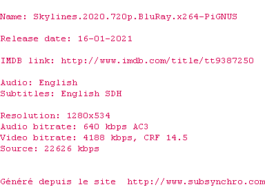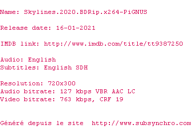 Voir le nfo de la release Skylines.2020.1080p.BluRay.x264-PiGNUS