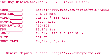 Voir le nfo de la release The.Boy.Behind.The.Door.2020.BDRip.x264-GAZER