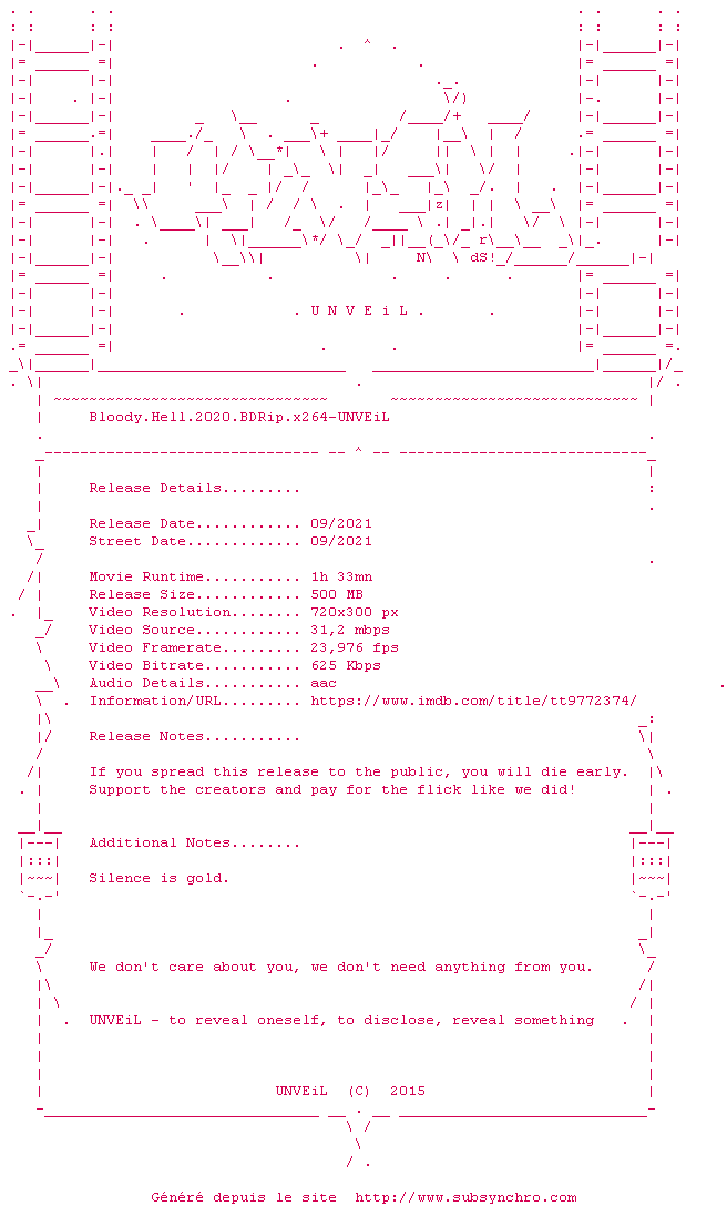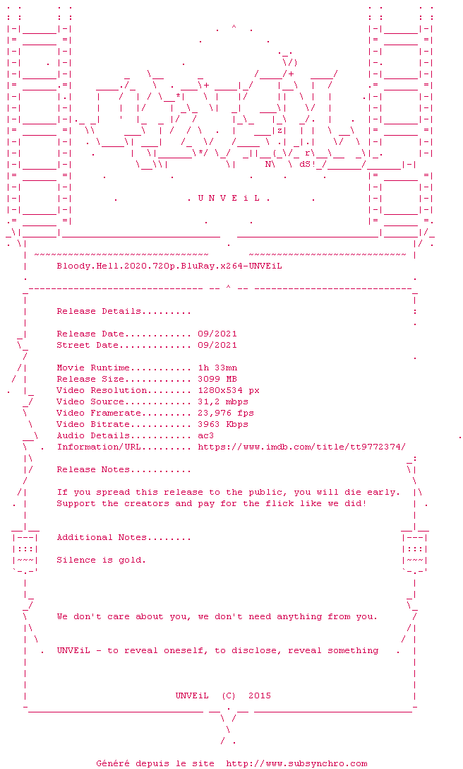 Voir le nfo de la release Bloody.Hell.2020.BDRip.x264-UNVEiL