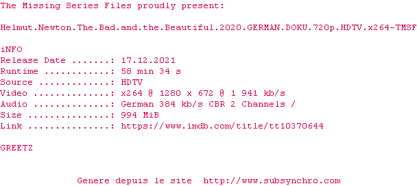 Y avez-vous pense ? Nous proposons déjà 1660 sous-titres pour le film Helmut Newton: L'Effronté. Avez-vous essaye de voir si ces sous-titres etaient compatibles avec cette release ? On vous laisse le soin de tester cela pour nous et de contribuer au site en postant le sous-titre en cas de compatiblite constatee !