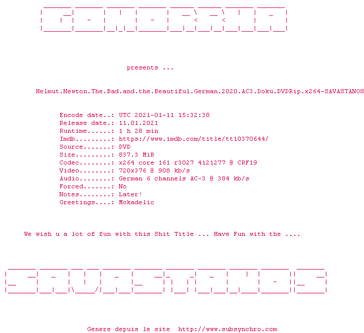 Y avez-vous pense ? Nous proposons déjà 1660 sous-titres pour le film Helmut Newton: L'Effronté. Avez-vous essaye de voir si ces sous-titres etaient compatibles avec cette release ? On vous laisse le soin de tester cela pour nous et de contribuer au site en postant le sous-titre en cas de compatiblite constatee !