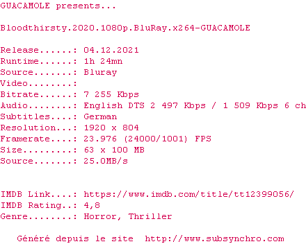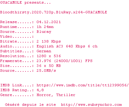 Voir le nfo de la release Bloodthirsty.2020.BDRiP.x264-GUACAMOLE