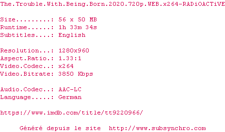 | VXT | The.Trouble.With.Being.Born.2020.GERMAN.1080p.WEBRip.x265-VXT OpenSubtitles | 0 fichier |