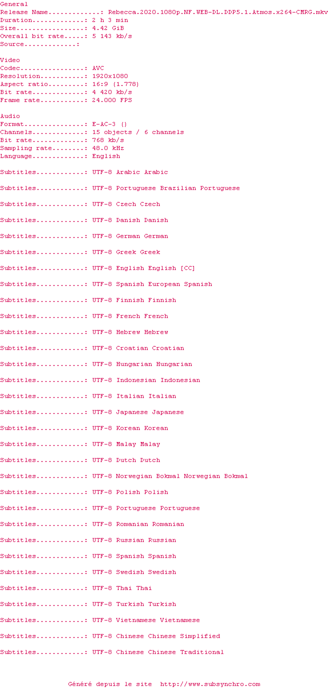 Voir le nfo de la release Rebecca.2020.1080p.NF.WEB-DL.DDP5.1.Atmos.x264-CMRG