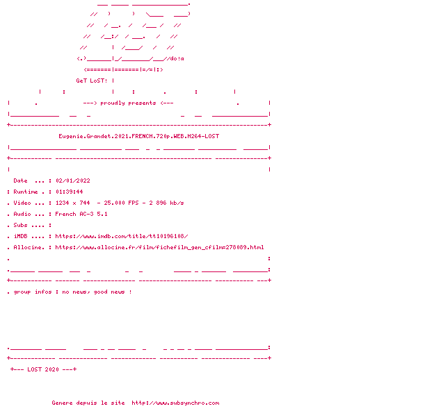Voir le nfo de la release Eugenie.Grandet.2021.FRENCH.720p.WEB.H264-LOST