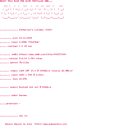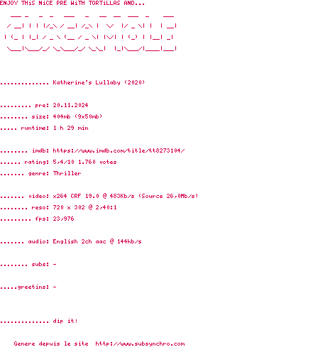 Voir le nfo de la release Katherines.Lullaby.2020.BDRiP.x264-GUACAMOLE