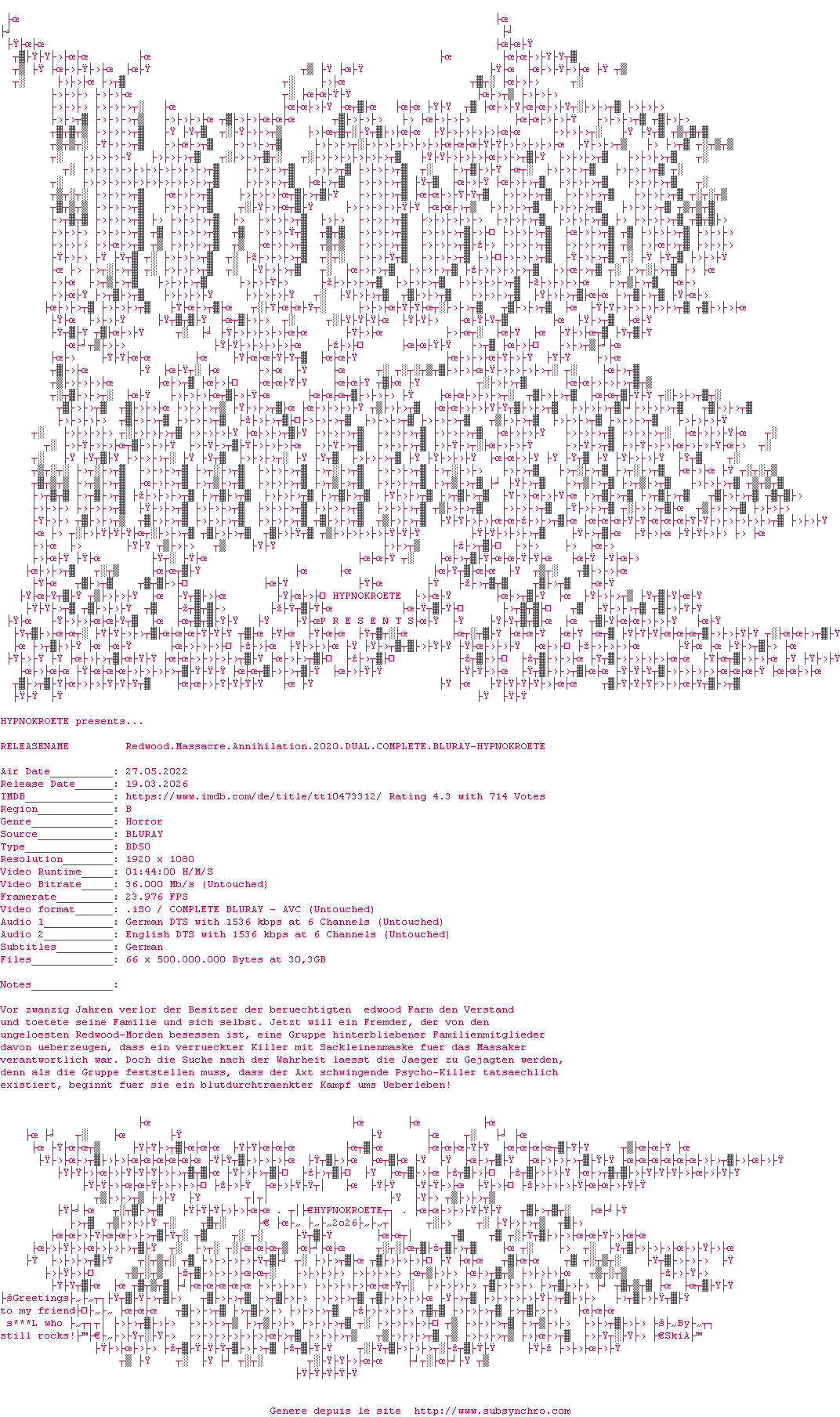 | Voir le nfo de la release Redwood.Massacre.Annihilation.2020.DUAL.COMPLETE.BLURAY-HYPNOKROETE | HYPNOKROETE | Redwood.Massacre.Annihilation.2020.DUAL.COMPLETE.BLURAY-HYPNOKROETE OpenSubtitles | 0 fichier |