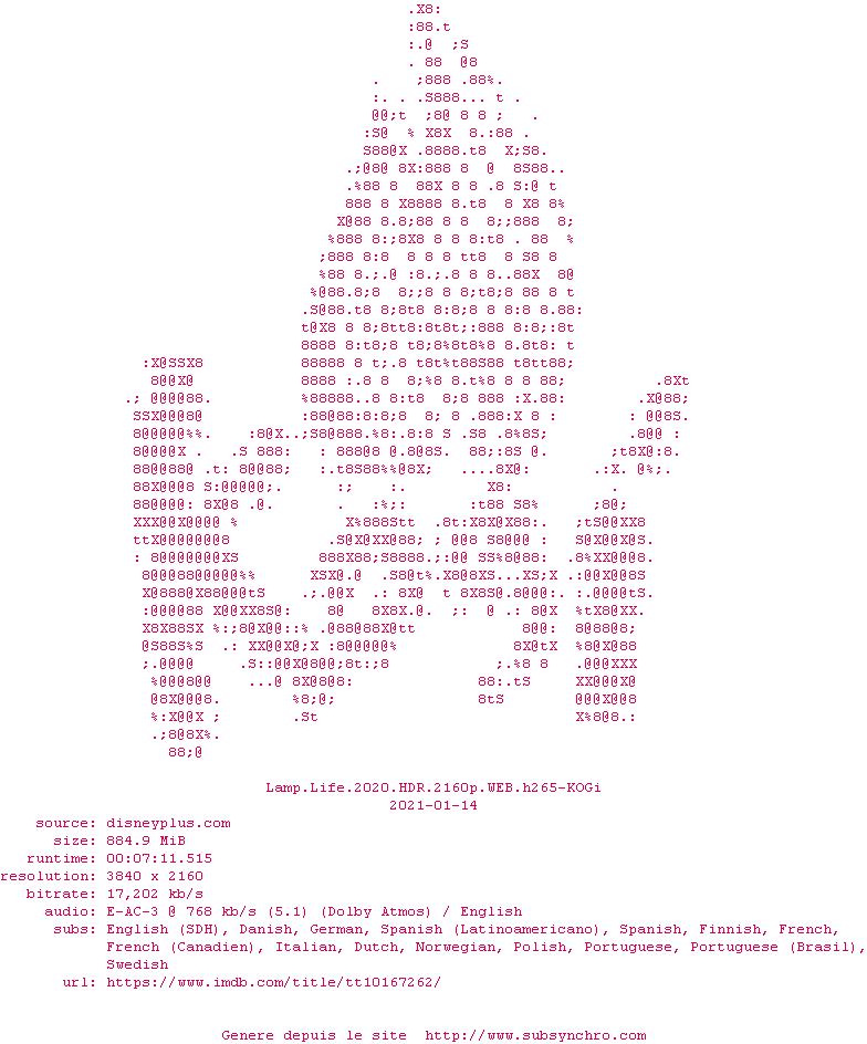 Y avez-vous pense ? Nous proposons déjà 1508 sous-titres pour le film La Vie en lumière. Avez-vous essaye de voir si ces sous-titres etaient compatibles avec cette release ? On vous laisse le soin de tester cela pour nous et de contribuer au site en postant le sous-titre en cas de compatiblite constatee !