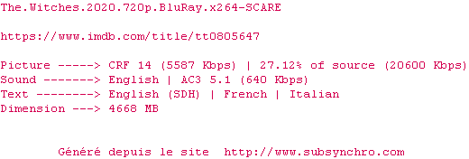 Telechargez le RSS « Fichier de la release The.Witches.2020.720p.BluRay.x264-SCARE »