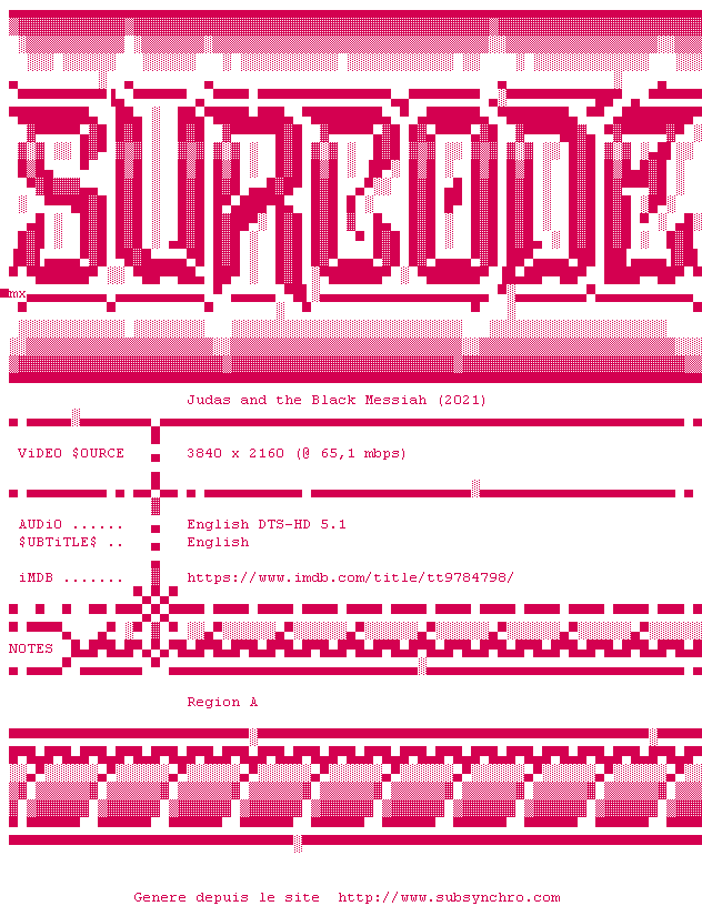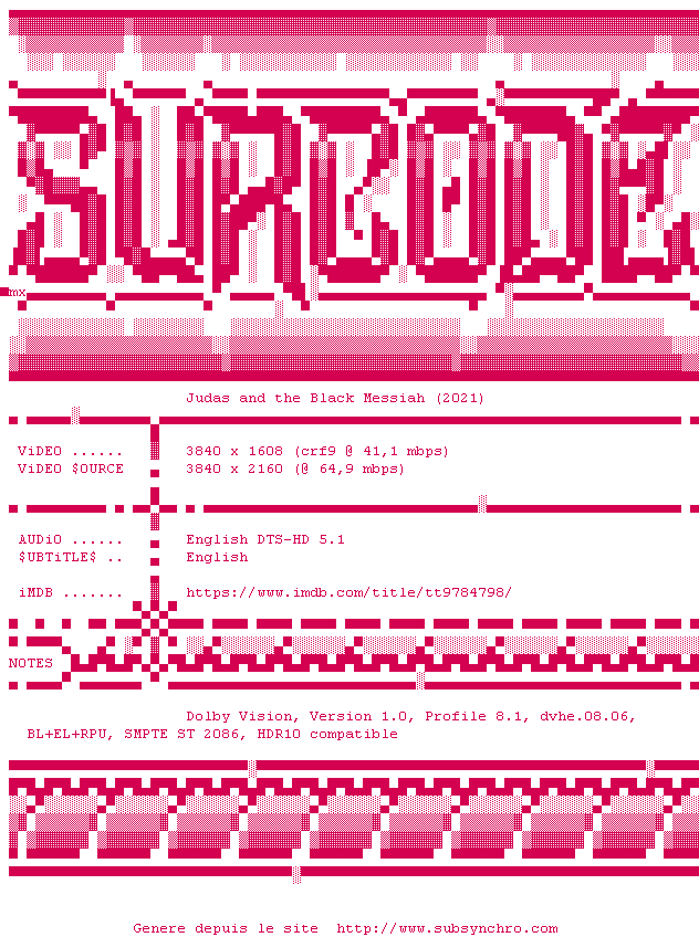 Voir le nfo de la release Judas.And.The.Black.Messiah.2021.2160p.UHD.BluRay.x265-SURCODE
