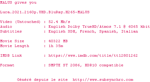Voir le nfo de la release Luca.2021.2160p.UHD.BluRay.H265-MALUS