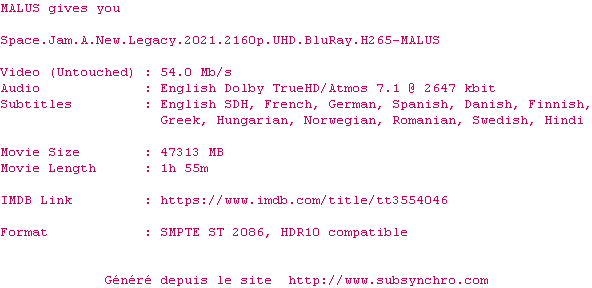 LeBron n'a même pas essayé de jouer. Warner est en perdition totale à essayer de montrer ce qu'elle possède comme franchises ou films ! Réussir à passer du "Fury Road" dans un film pour enfants, fallait oser. La seule chose qui passe, c'est la qualité sonore et quelques musiques, mais le scénario est pathétique, les scènes incompréhensibles, un gâchis qui vient profondément salir le film avec Michael Jordan. Pourquoi forcément chercher une star de basket ? Pourquoi pas de foot américain ou de baseball ? Ces dernières années, la Warner gâche tout !