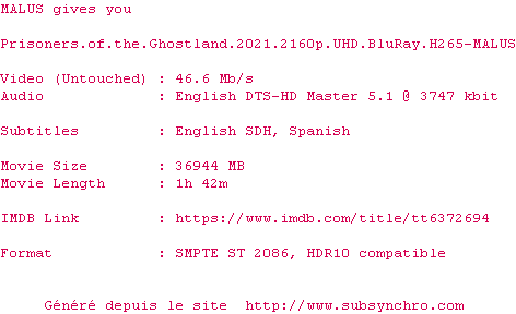 Voir le nfo de la release Prisoners.Of.The.Ghostland.2021.2160p.UHD.BluRay.H265-MALUS