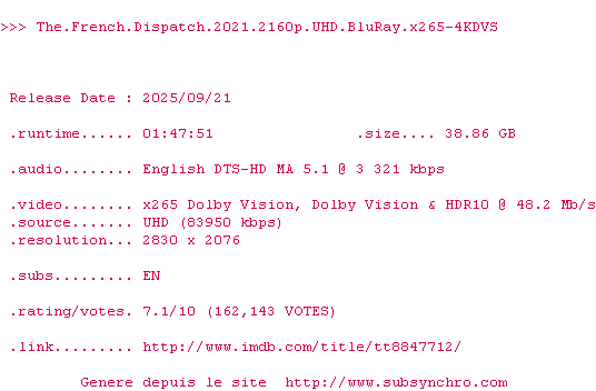 Voir le nfo de la release The.French.Dispatch.2021.MULTi.2160p.UHD.BluRay.x265-UKDHD