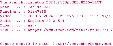 Voir le nfo de la release The.French.Dispatch.2021.2160p.WEB.H265-SLOT
