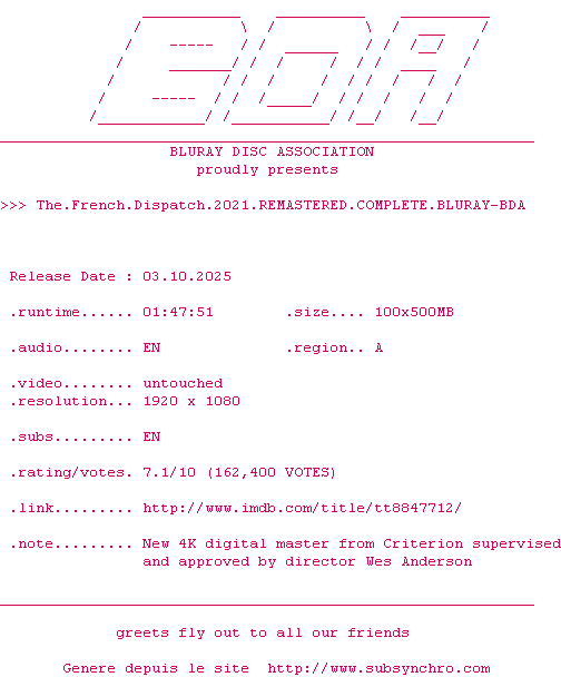 Voir le nfo de la release The.French.Dispatch.2021.REMASTERED.COMPLETE.BLURAY-BDA
