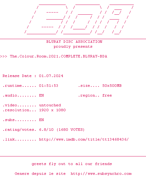 Voir le nfo de la release The.Colour.Room.2021.1080p.BluRay.x264-RUSTED