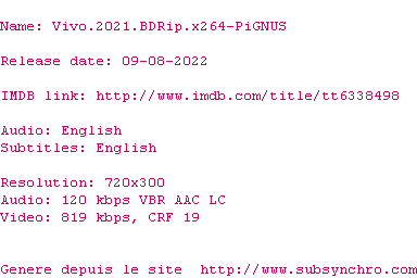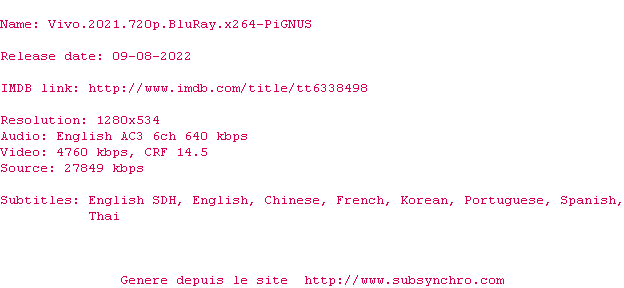Voir le nfo de la release Vivo.2021.BDRip.x264-PiGNUS