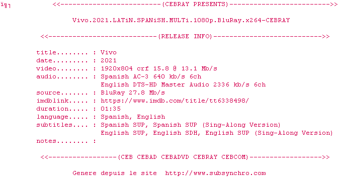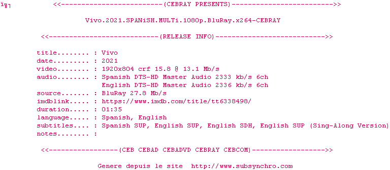 Voir le nfo de la release Vivo.2021.SPANiSH.MULTi.1080p.BluRay.x264-CEBRAY