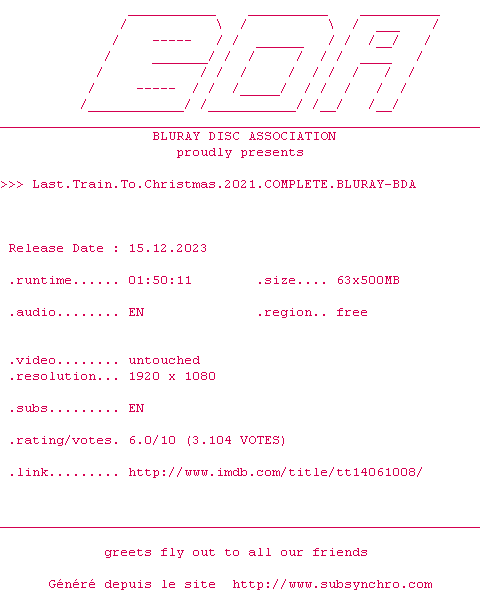 | Voir le nfo de la release Last.Train.To.Christmas.2021.COMPLETE.BLURAY-BDA | BDA | Last.Train.To.Christmas.2021.COMPLETE.BLURAY-BDA OpenSubtitles | 0 fichier | ||