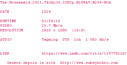 Voir le nfo de la release The.Housemaid.2021.TAGALOG.1080p.BLURAY.x264-HOA