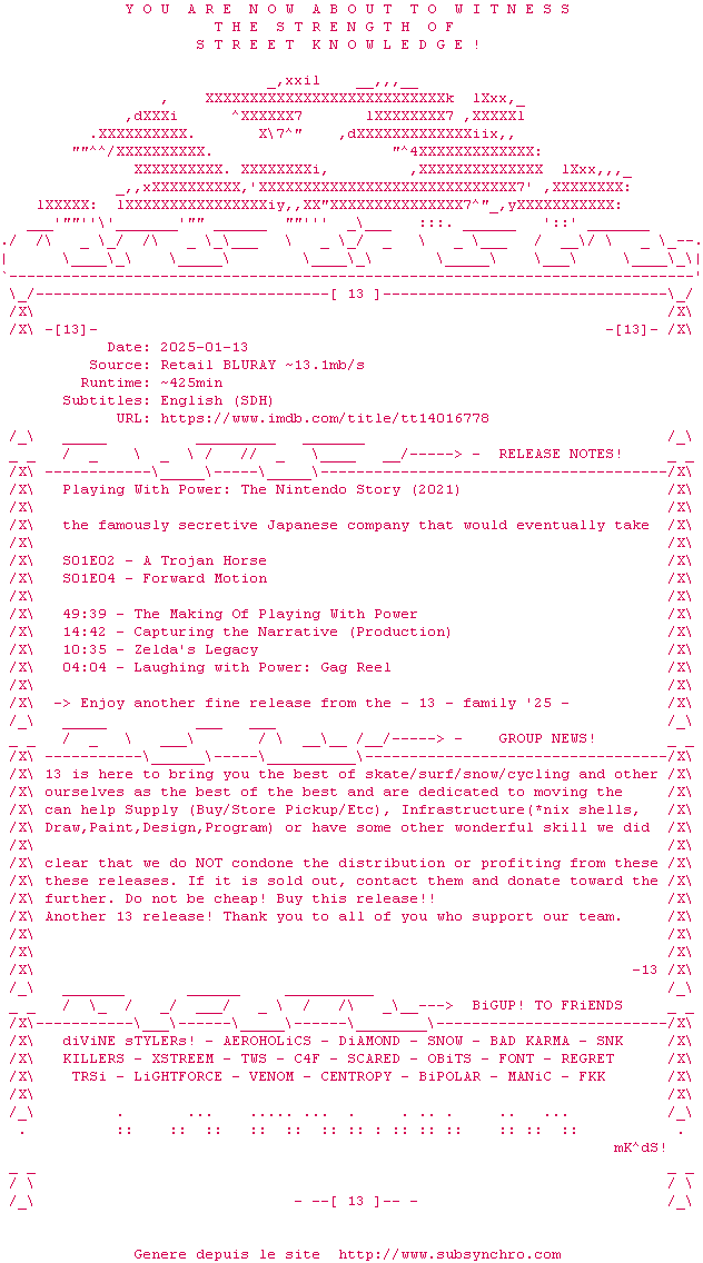 Voir le nfo de la release Playing.With.Power.The.Nintendo.Story.2021.COMPLETE.BLURAY-13
