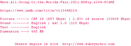 Voir le nfo de la release Were.All.Going.To.The.Worlds.Fair.2021.BDRip.x264-SCARE