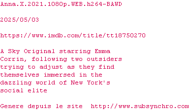 | Voir le nfo de la release Anna.X.2021.2160p.WEB.H265-BAWD | BAWD | Anna.X.2021.2160p.WEB.H265-BAWD OpenSubtitles La release Anna.X.2021.2160p.WEB.H265-BAWD est en 4K | 0 fichier | ||