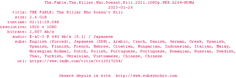 | Voir le nfo de la release The.Fable.The.Killer.Who.Doesnt.Kill.2021.1080p.WEB.H264-NOMA | NOMA | The.Fable.The.Killer.Who.Doesnt.Kill.2021.1080p.WEB.H264-NOMA OpenSubtitles | 0 fichier | ||