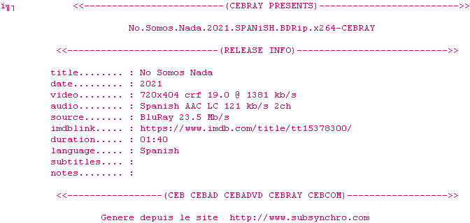 Telechargez le RSS « Fichier de la release No.Somos.Nada.2021.SPANiSH.BDRip.x264-CEBRAY »