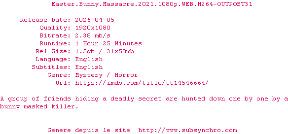 Y avez-vous pense ? Nous proposons déjà 1594 sous-titres pour le film Easter Bunny Massacre. Avez-vous essaye de voir si ces sous-titres etaient compatibles avec cette release ? On vous laisse le soin de tester cela pour nous et de contribuer au site en postant le sous-titre en cas de compatiblite constatee !