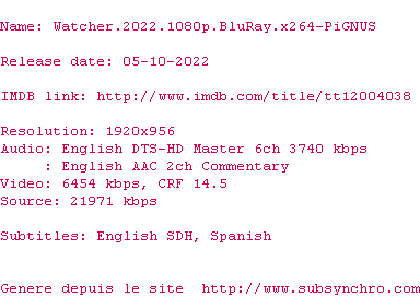 Voir le nfo de la release Watcher.2022.1080p.BluRay.x264-PiGNUS