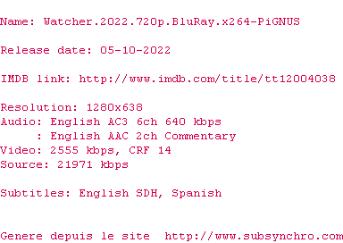 Voir le nfo de la release Watcher.2022.720p.BluRay.x264-PiGNUS