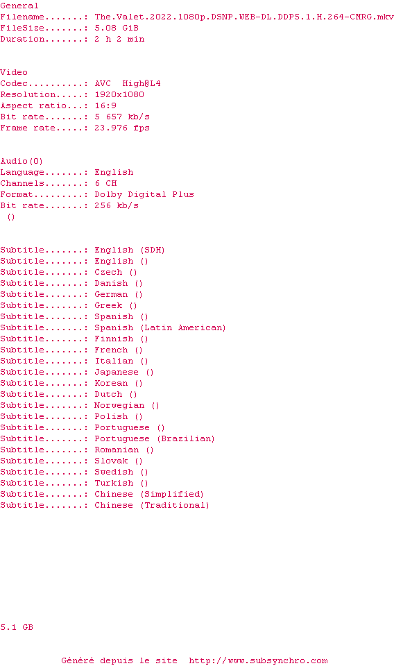 | CMRG | The.Valet.2022.1080p.HULU.WEB-DL.DDP5.1.H.264-CMRG OpenSubtitles | 0 fichier |