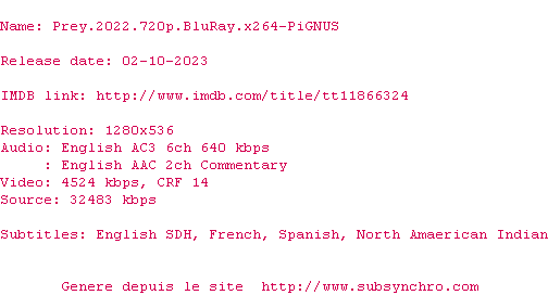 Le commentaire de Yaumegui Commente par Yaumegui (628), Le Jeudi 11 Aout 2022 à 20h37 Le premier est indépassable par la surprise et la violence. Ce film est une redite avec une auctochone plus maline que les hommes, "rouges" ou blancs. Sans surprise. 4.5 / 10 0 0