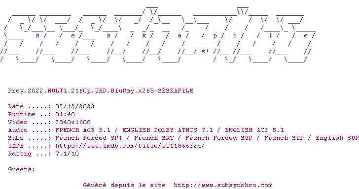 Le commentaire de oleo Commente par oleo (129), Le Vendredi 12 Aout 2022 à 12h30 parmi totues les daubes faites sur cette franchise, franchement c'est un bon spectacle que voila. il y a des longueurs et les scènes avec les trappeurs sont ratées dans le rythme (et bon sang pourquoi pas acteurs québécois et non des acteurs qui annonent pour certains du français sans rien comprendre de totue évidence) Un bon moment avec une jeune femme qui tient la route et pourquoi pas une suite... 6 / 10 0 0