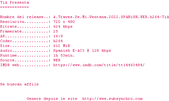 Voir le nfo de la release A.Traves.De.Mi.Ventana.2022.iNTERNAL.SPANiSH.WEB.H264-TiA