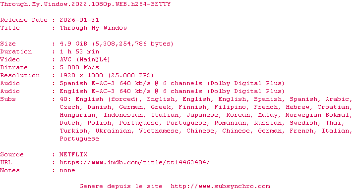 Y avez-vous pense ? Nous proposons déjà 2100 sous-titres pour le film À travers ma fenêtre / Through My Window. Avez-vous essaye de voir si ces sous-titres etaient compatibles avec cette release ? On vous laisse le soin de tester cela pour nous et de contribuer au site en postant le sous-titre en cas de compatiblite constatee !