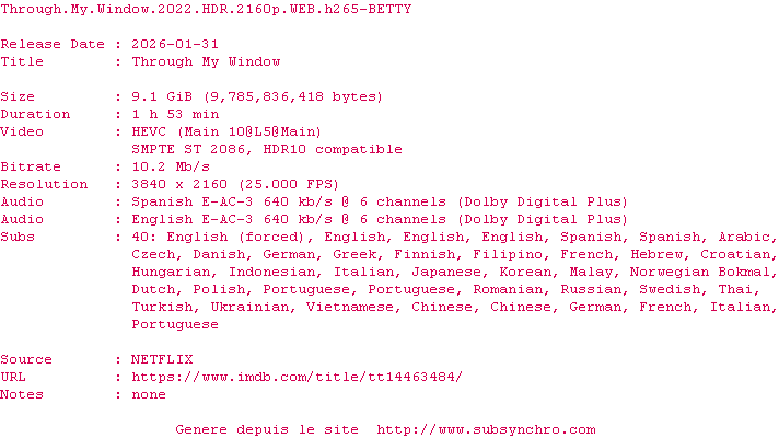 La release Through.My.Window.2022.HDR.2160p.WEB.H265-BETTY est en 4K