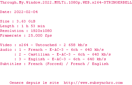 Y avez-vous pense ? Nous proposons déjà 2100 sous-titres pour le film À travers ma fenêtre / Through My Window. Avez-vous essaye de voir si ces sous-titres etaient compatibles avec cette release ? On vous laisse le soin de tester cela pour nous et de contribuer au site en postant le sous-titre en cas de compatiblite constatee !