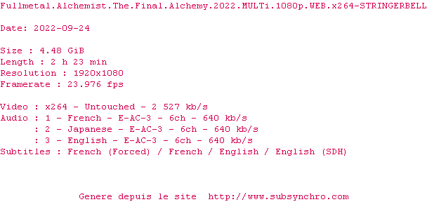 Y avez-vous pense ? Nous proposons déjà 1516 sous-titres pour le film Fullmetal Alchemist : La dernière alchimie / Fullmetal Alchemist: Final Transmutation. Avez-vous essaye de voir si ces sous-titres etaient compatibles avec cette release ? On vous laisse le soin de tester cela pour nous et de contribuer au site en postant le sous-titre en cas de compatiblite constatee !