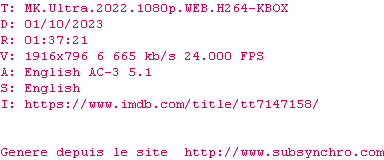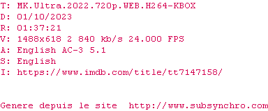 | Voir le nfo de la release MK.Ultra.2022.720p.WEB.H264-KBOX | KBOX | MK.Ultra.2022.720p.WEB.H264-KBOX OpenSubtitles | 0 fichier |