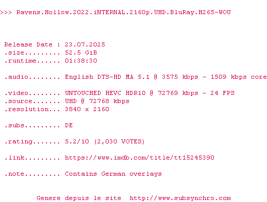 Voir le nfo de la release Ravens.Hollow.2022.MULTi.COMPLETE.UHD.BLURAY-WRECKED
