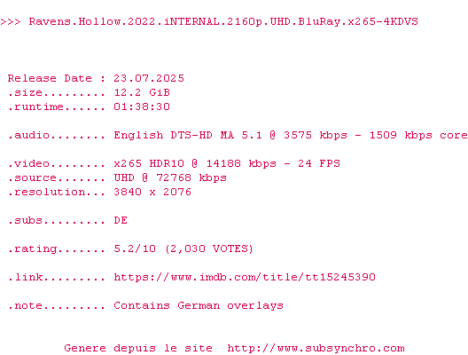 Voir le nfo de la release Ravens.Hollow.2022.iNTERNAL.2160p.UHD.BluRay.x265-4KDVS