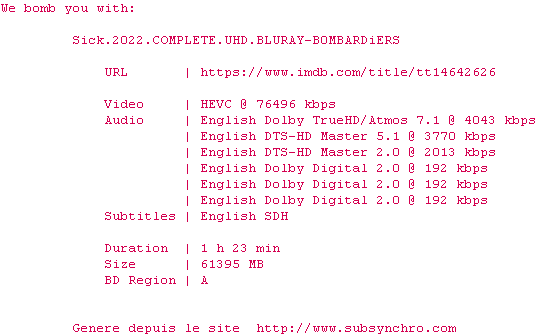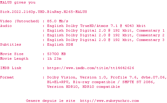 Voir le nfo de la release Sick.2022.2160p.UHD.BluRay.H265-MALUS