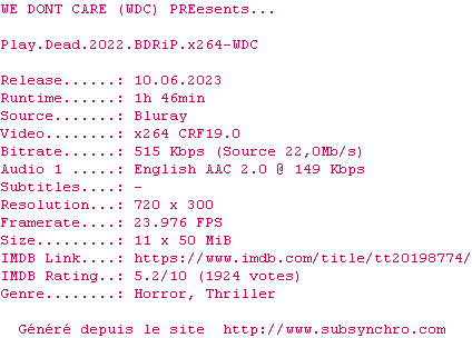 Voir le nfo de la release Play.Dead.2022.1080p.BluRay.x264-WDC